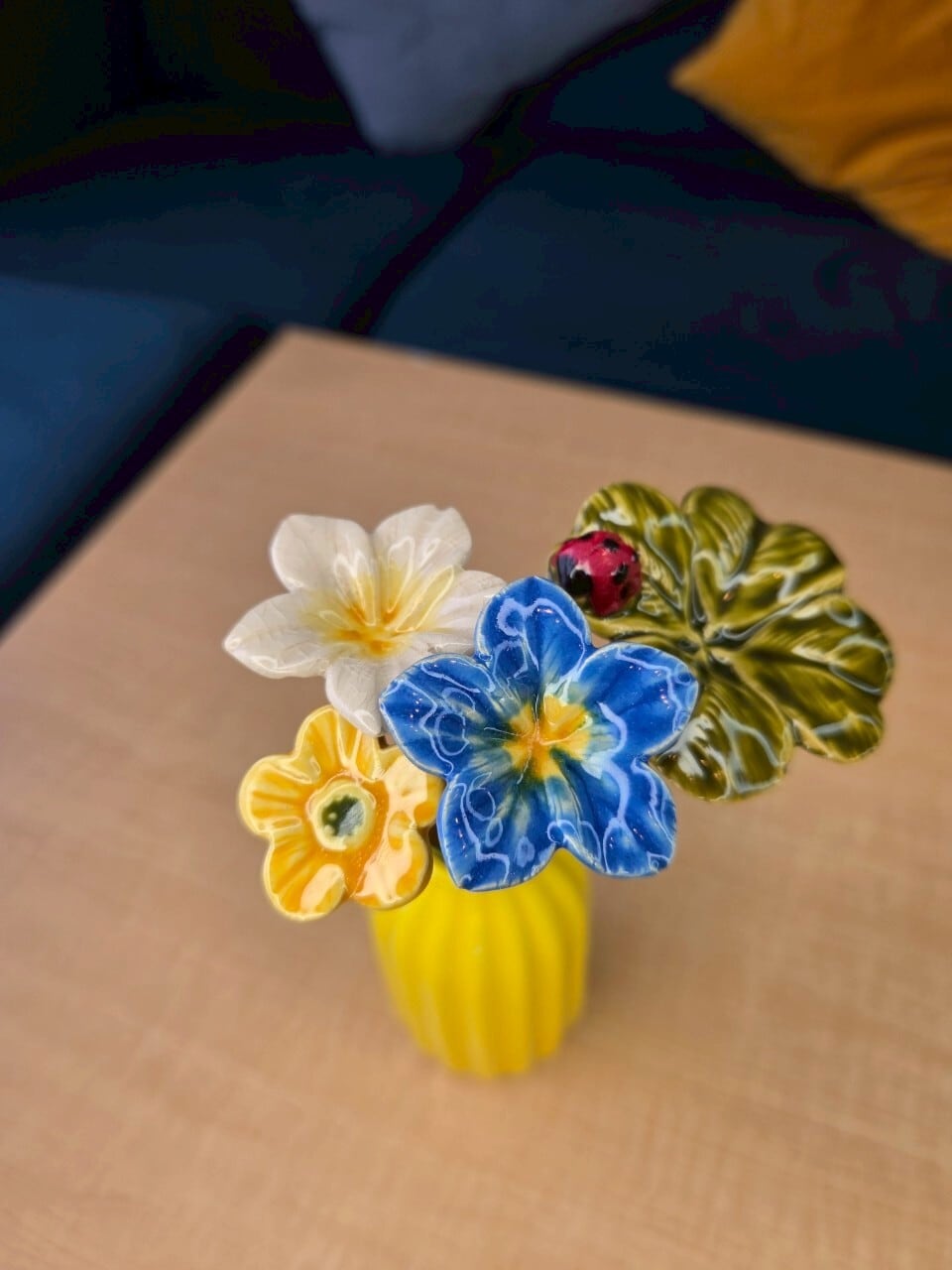 鮮やかな色合いと可憐なフォルムが魅力のミラベル。 直径約4cmの花びらは、職人の手でひとつひとつ丁寧に成形・彩色されています。 ワイヤーの長さは約22cmで、単体で飾っても、他のお花と組み合わせても美しいアレンジが楽しめます。 水やりやお手入れは不要で、屋内外どちらでも長くお使いいただけます。 贈り物や日々のインテリアに、永く咲き続ける陶器の花をどうぞ。